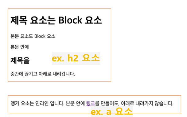 - Inline Element : 추가해도 줄바꿈 X / 내용의 크기만큼 폭을 차지.
