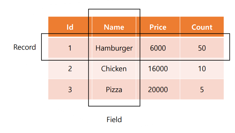 - 필드 : 속성 또는 칼럼. 각 필드에는 고유한 데이터 형식이 지정됨.