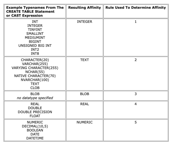 그러나 SQLite는 호환성을 위해 Type Affinity(타입 선호도)라는 개념을 적용한다... (다른 DB에서 흔히 사용하는 타입을 SQLite의 타입으로 변환 해준다!!)