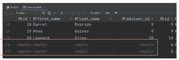 ON student.advisor_id = instructor.id; --오른쪽(instructor)만 있는 데이터도 모두 표시
