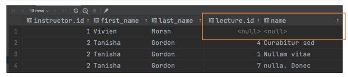 ON instructor.id = lecture.instructor_id; --왼쪽(instructor)만 있는 데이터도 모두 표시