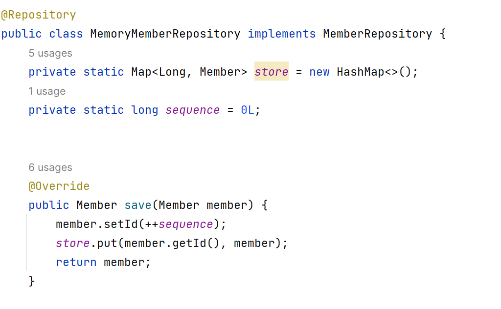 MemberRepository의 구현체인 MemoryMemberRepository로 가서 애너테이션을 달아주었다.