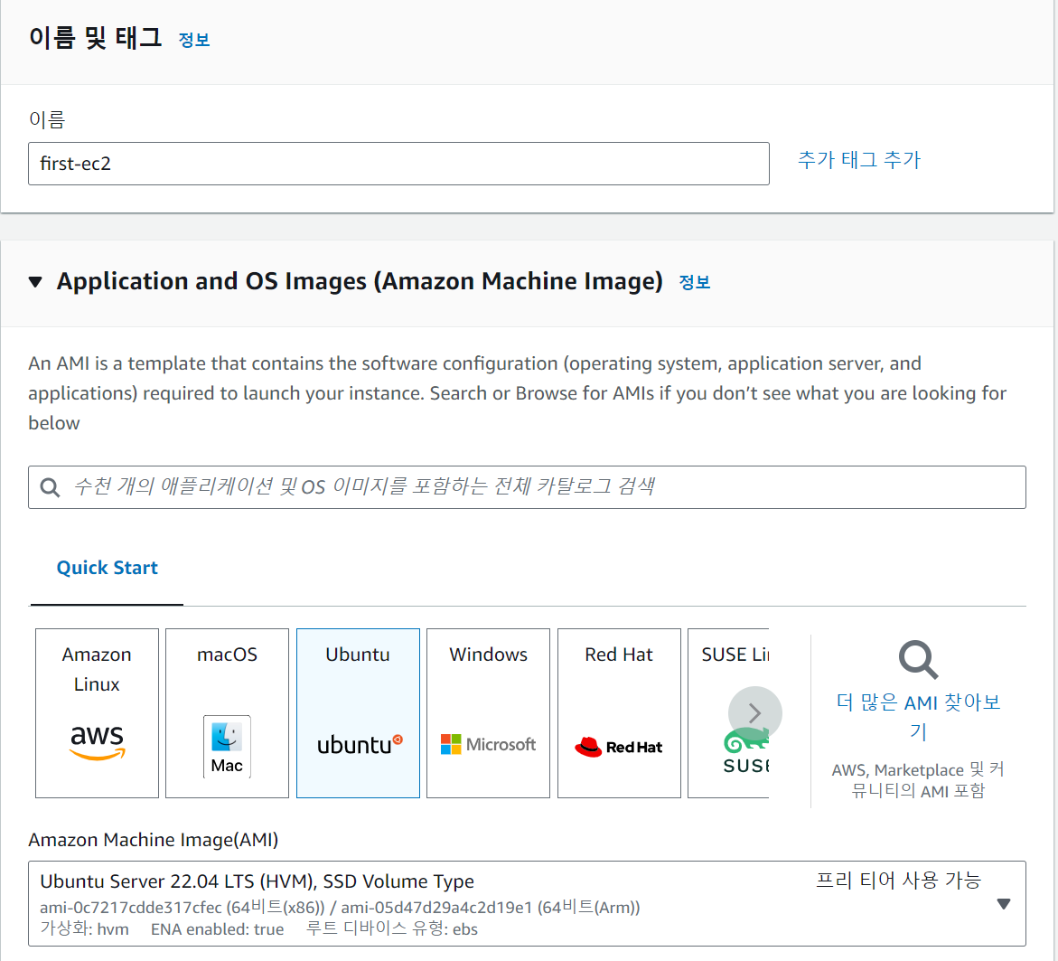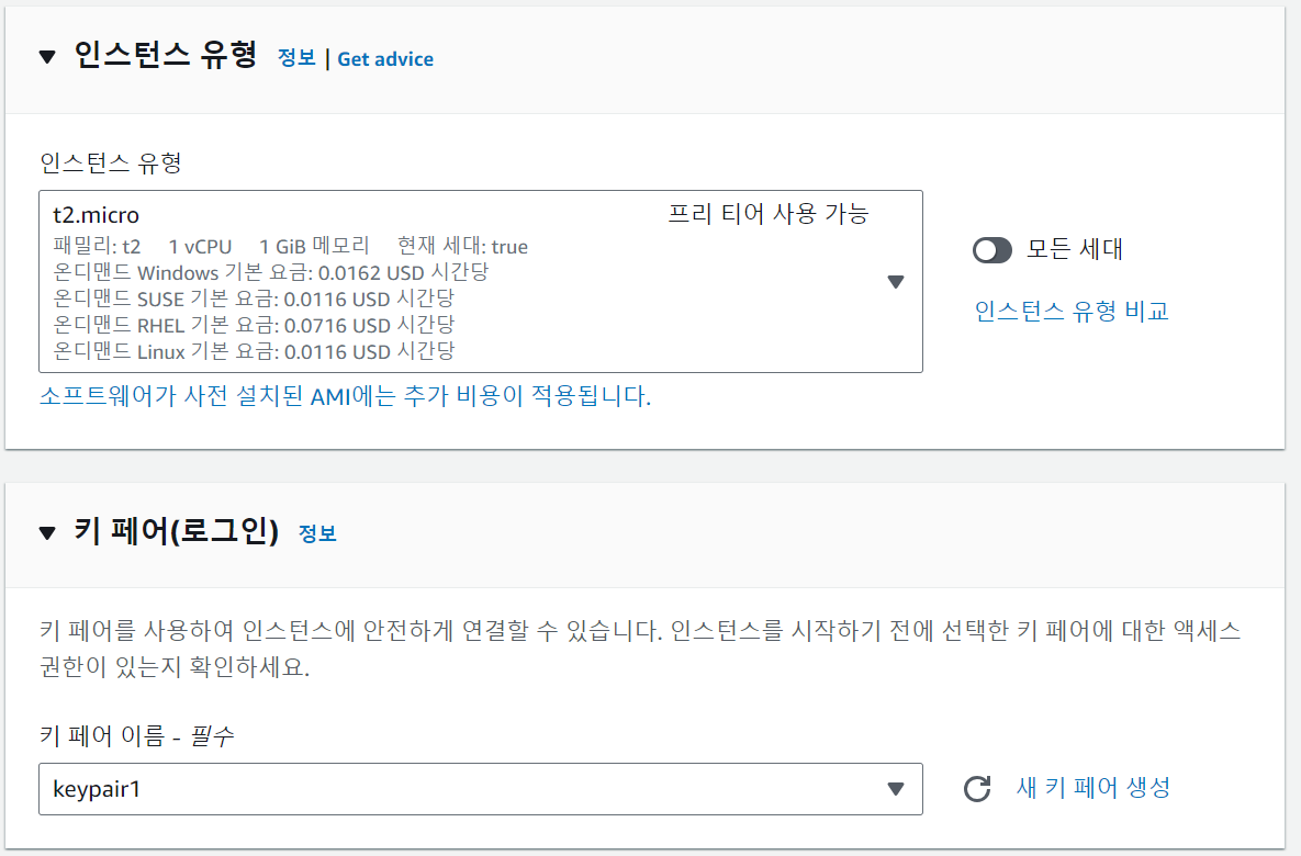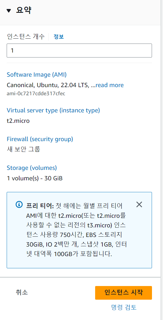 3) 인스턴스 유형 선택 : 컴퓨터 사양으로 프리티어 사용