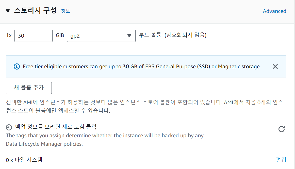 6) 스토리지 구성 : 하드디스크 용량. (30GiB까지는 무료)