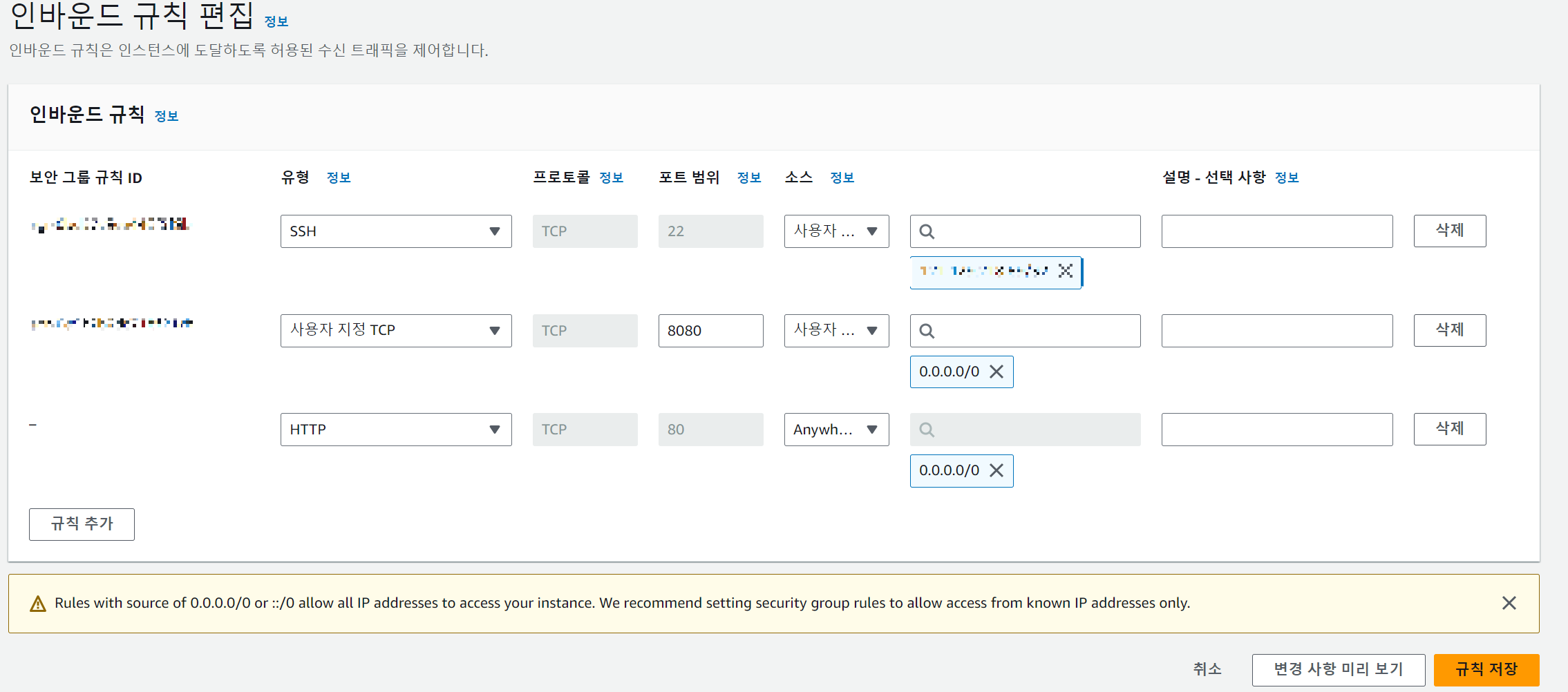 3) 인바운드 규칙 편집하여 HTTP로 추가.