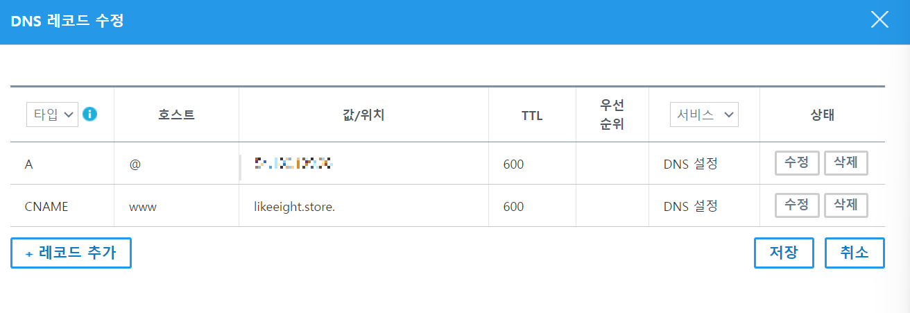 - 타입 : DNS 레코드의 종류. 도메인에 IP를 연결하거나, 도메인을 다른 도메인의 이름으로 지정하는 등의 기록.