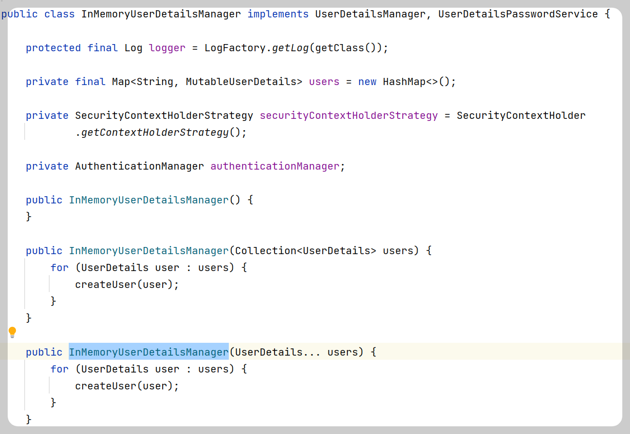 얘는 UserDetailsManager 인터페이스를 구현한 구현체 클래스이다! 여기를 보면 여러가지 클래스 자체의 메서드들이 있고, 또 아래로 내려가보면