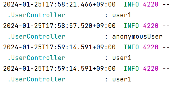 - SecurityContextHolder.getContext().getAuthentication.getName()을 통해서도 가져올 수 있다. (만약 로그인되지 않은 상태라면 결과가 anonymousUser로 나온다.)