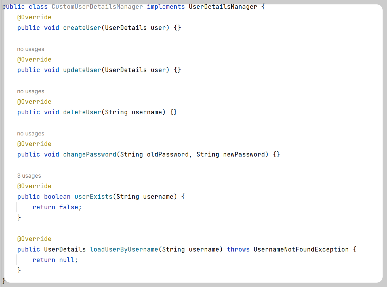 그러면 내 마음대로 커스텀하면 된다. 예를 들어 CustomUserDetails라는 클래스를 만들어, UserDetailsManager를 implements 해준다. 그러면 이렇게 UserDetailsManager에 미리 정의해둔 추상 메서드들을 무조건 오버라이딩해서 내 마음대로 커스텀할 수 있다.