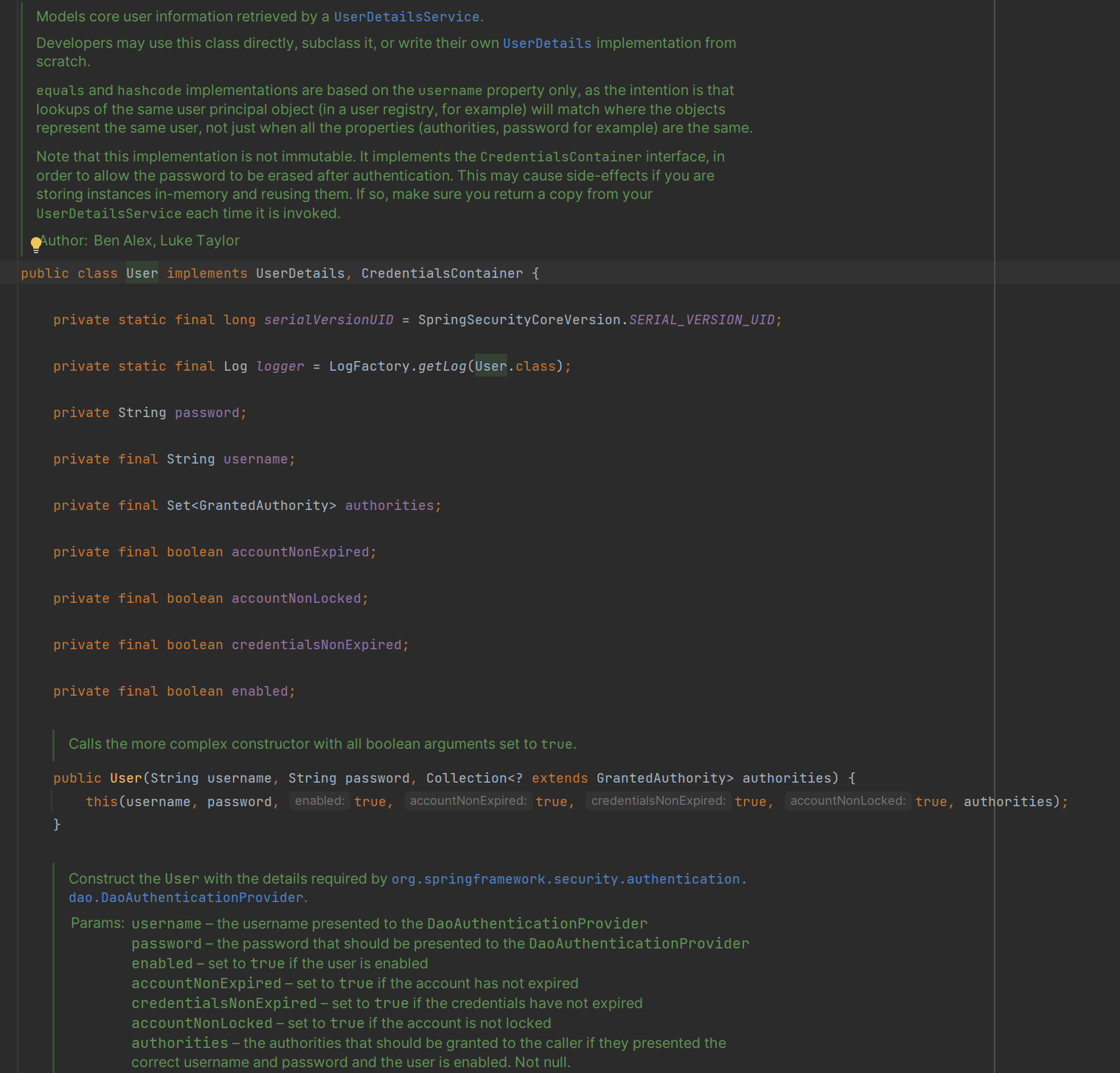 - 설명을 보자면 Spring Security에서 구현체들이 바로 사용되지는 않는다. 그저 사용자의 정보를 저장할 뿐 > 이후 Authentication object로 캡슐화될 것이라는 것.