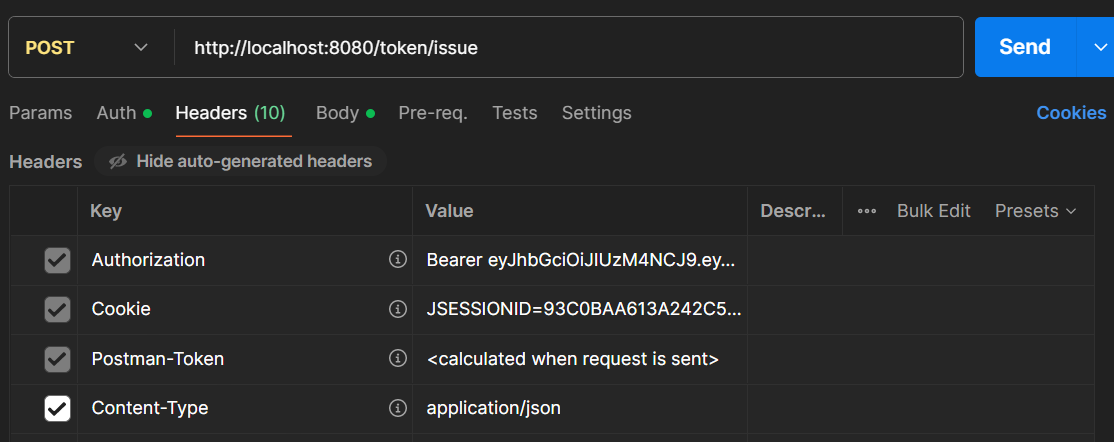 토큰을 발행하고, 그 발행한 토큰을 만료 전에 Authorization headers에 넣어주고 실행!