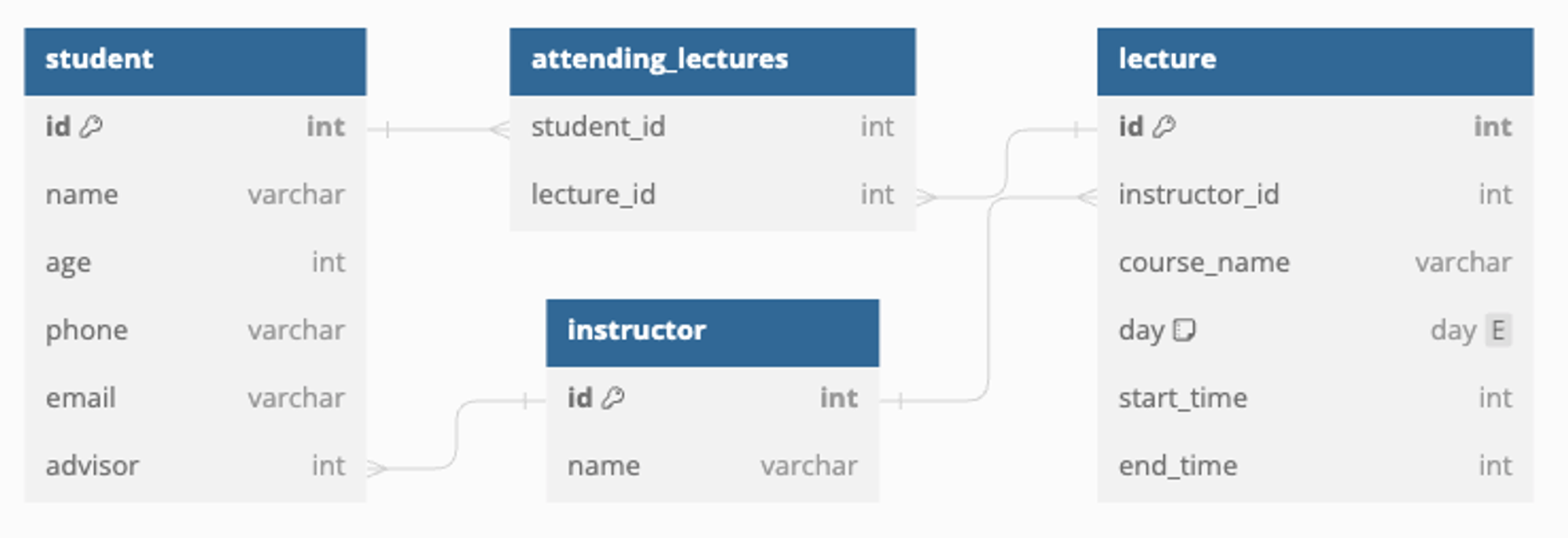 - Instructor는 여러 명의 Student의 어드바이저를 담당한다.