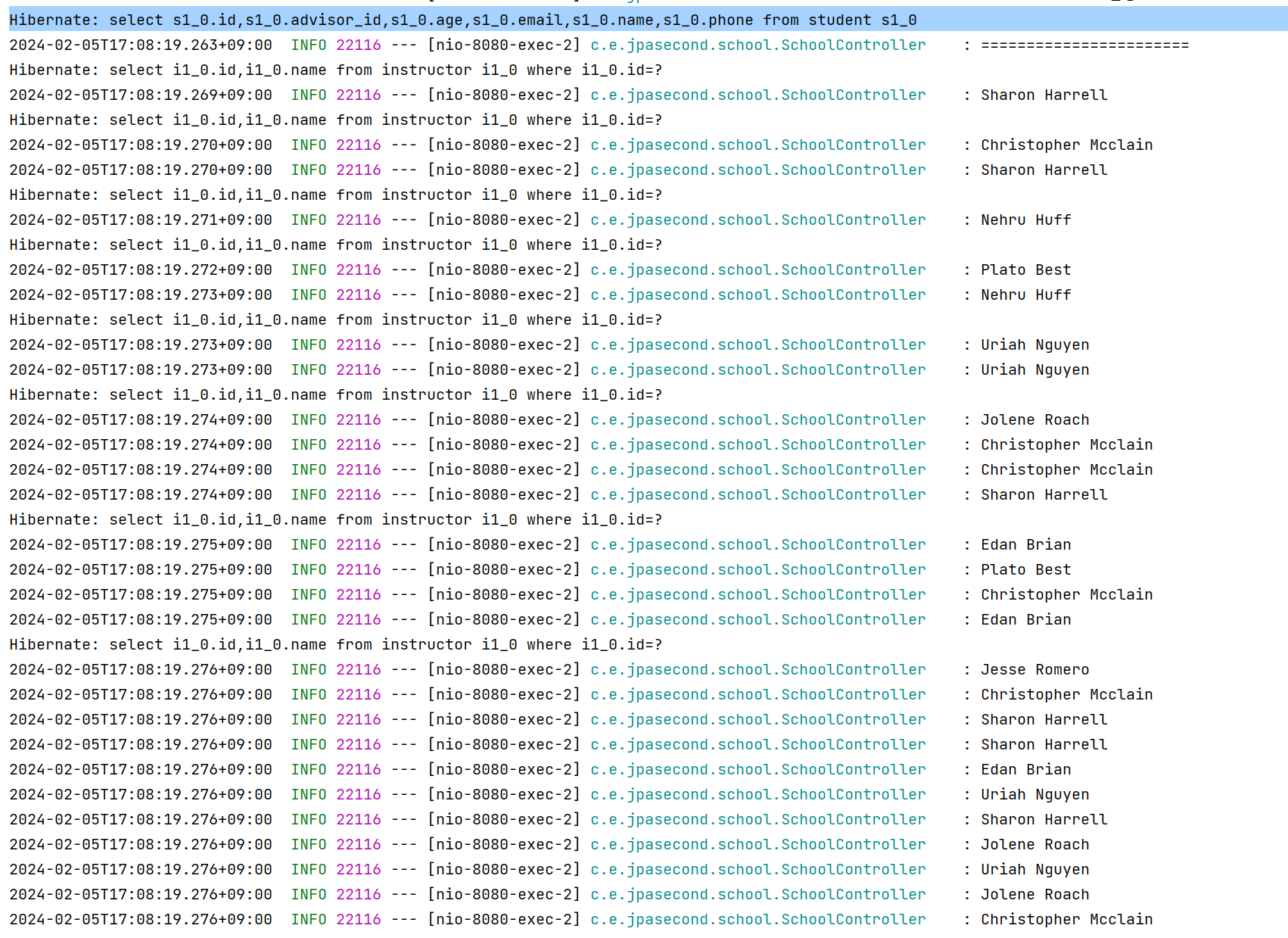 : 각각의 Instructor를 조회하면서 해당 Instructor를 advisor로 가진 Student를 조회하기 위해서 id를 advisor_id로 가지는 Student를 조회하는 SQL이 발생한다.