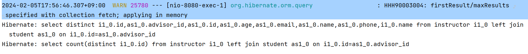 >> 페이징 처리 시 경고가 뜨면서 실행되는 SQL 쿼리에 LIMIT, OFFSET이 없는 채로 실행이 된다.