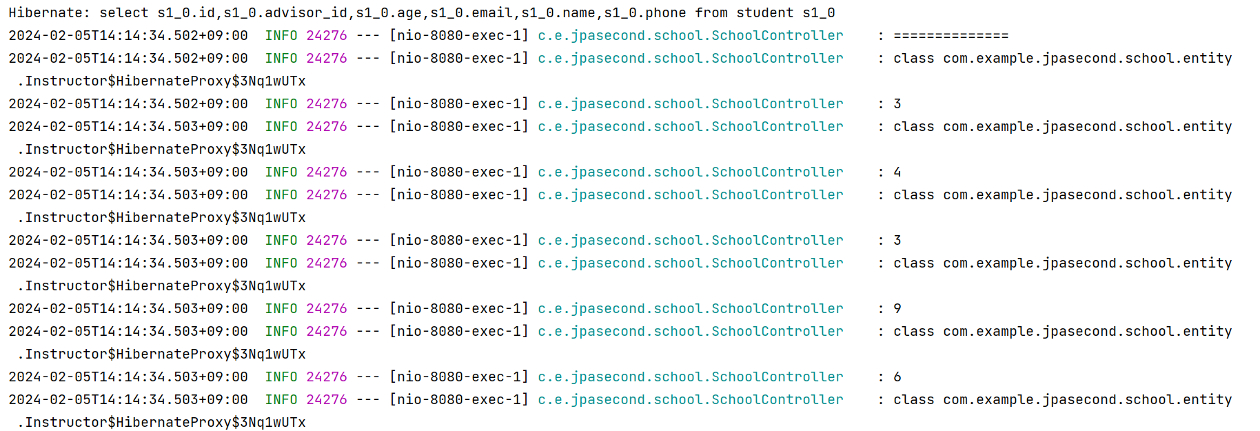: Student만 조회하려고 하지만, Instructor도 조회하려는 SQL이 있다. 왜냐하면 Student 엔티티 내부의 Instructor를 찾으려고 하면서 발생한다. (영속성 컨텍스트로 인해 이미 조회했던 데이터는 다시 검색하지 않기 때문에 중복되지 않는 Instructor만큼 실행됨)