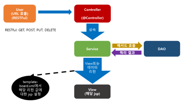 >> URL 호출 -> Controller -> Service -> ServiceImpl -> DAO -> DAOImpl -> Service -> View