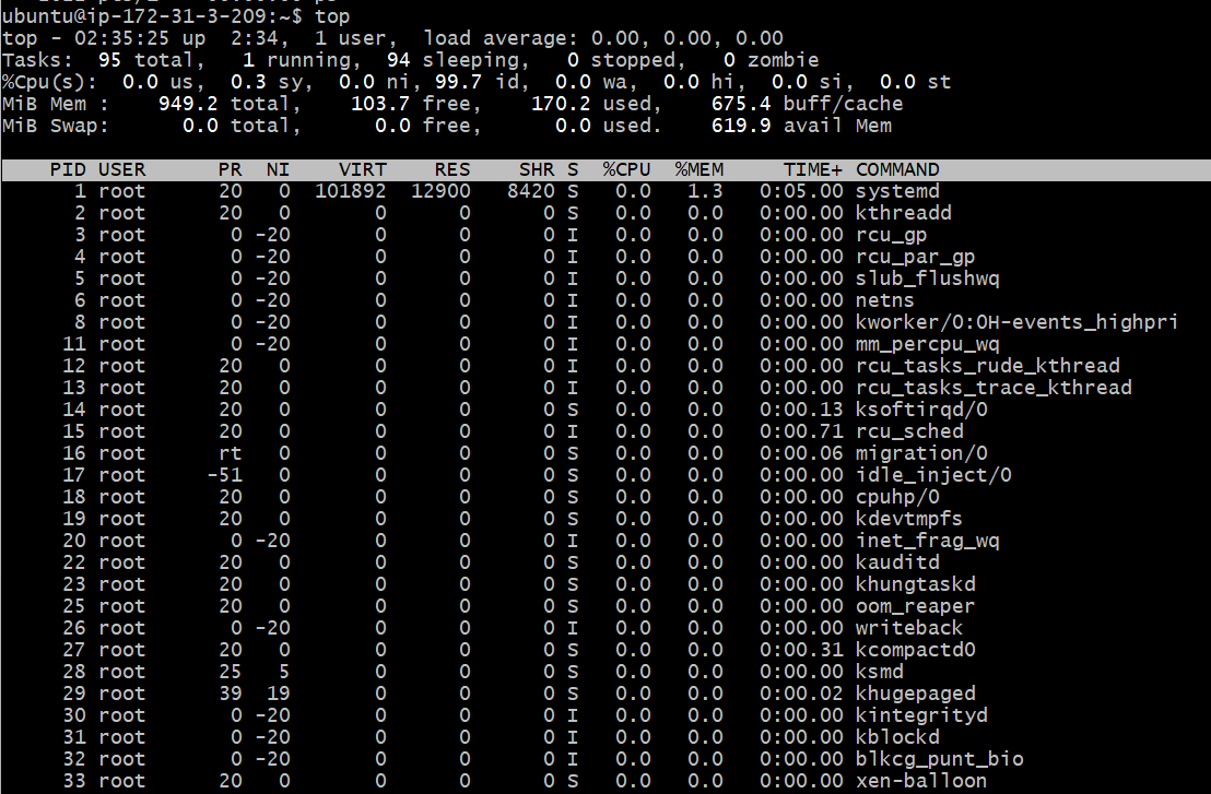 - top : CLI에서 사용하는 작업 관리자와 비슷. 현재 실행중인 프로세스를 나열해 보여준다. (q로 종료)