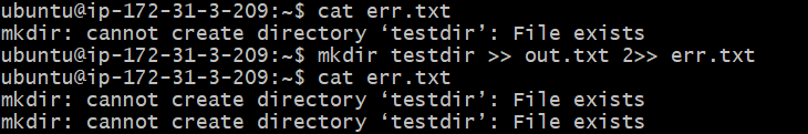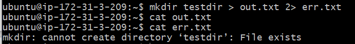 mkdir testdir > out.txt 2> err.txt