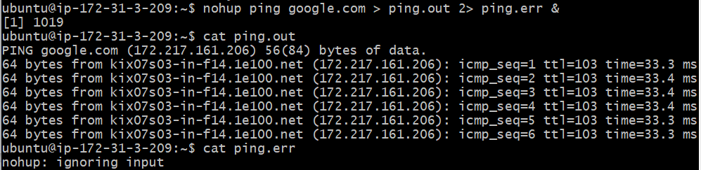 nohup ping google.com > ping.out 2>&1 &