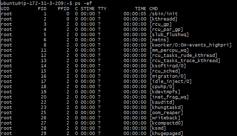 - ef : PID, PPID 확인 가능, 프로세스의 식별 정보, 프로세스의 부모-자식 관계 보기 좋음