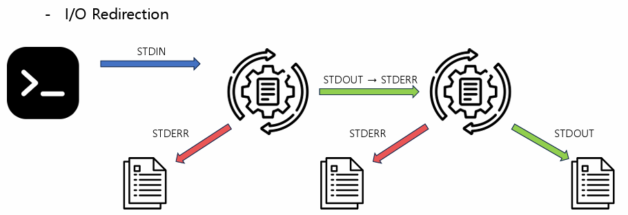: Shell에서 명령어를 사용하면 사용중인 터미널과 연결이 되며 명령어에 연산자를 추가할 경우 파일에 출력 내용을 작성하거나, 파일로부터 입력 내용을 받아올 수 있다.