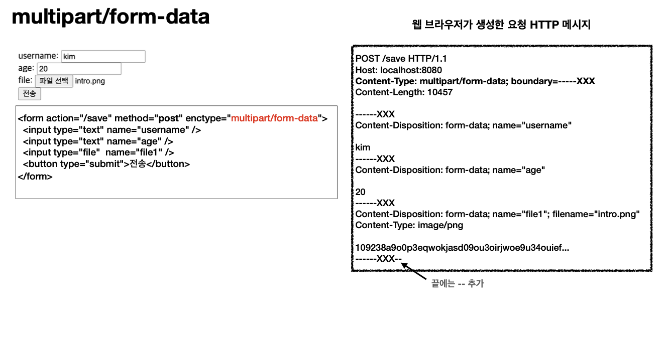 - 여러 컨텐츠 타입에 대한 데이터를 보낼 수 있다. (주로 파일 업로드 같은 바이너리 데이터를 전송할 때)