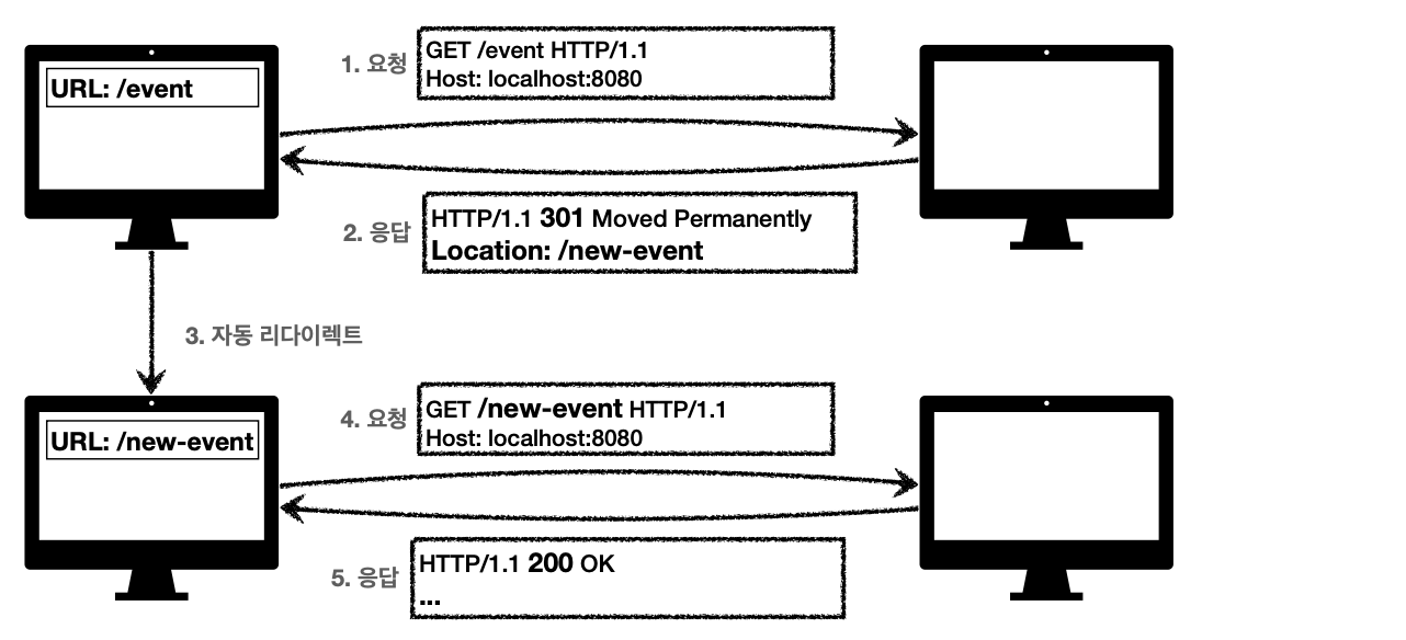 - 일시 리다이렉션 (302, 307, 303) : 일시적인 변경 (ex. 주문 완료 후 주문 내역 화면으로 이동)