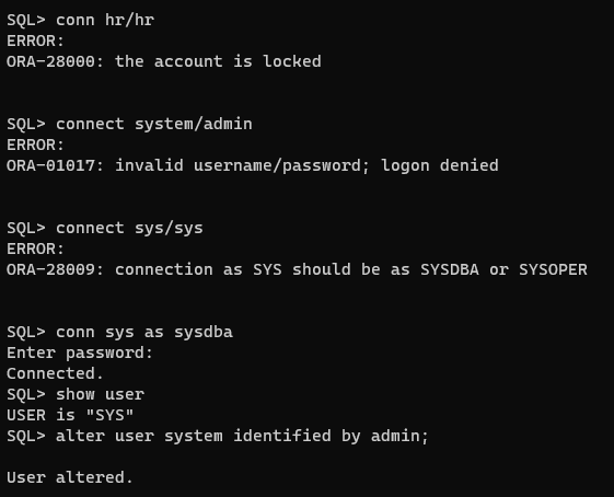 alter user system identified by admin;