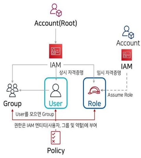: 사용자의 접근 권한을 관리하는 인증 기능. (AWS 계정은 계약을 관리하는 계정인데 반해, IAM은 각 서비스에 대한 접속을 관리하는 기능)