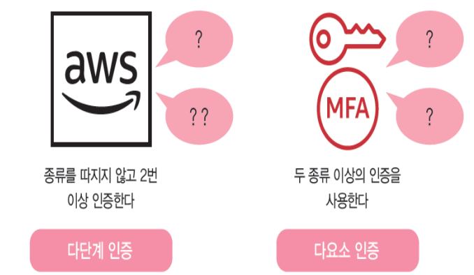 - 다요소 인증 : ID와 암호 뿐 아니라 전용 하드웨어 또는 생체 인증을 사용하는 등 다른 종류의 인증을 사용하는 것.