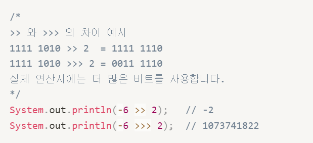 - RIGHT SHIFT(>>, >>>) : 비트를 오른쪽으로 이동. 부호의 보존 여부에 따라 다름
