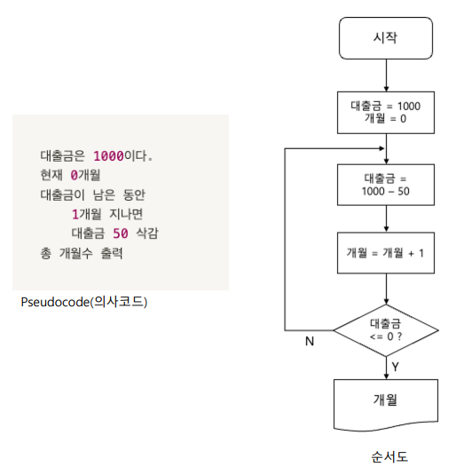 * 의사 코드와 순서도를 이용해 많이 표현된다.